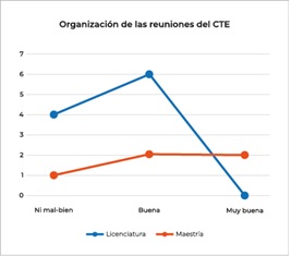 Acerca de la organización de las reuniones, no se encontraron diferencias significativas, los docentes con maestría tienen un promedio de 4.20 ± 0.37, y los de licenciatura de 3.60 ± 0.16, (t (5.57) = -1.47; p<0.196) (Figura 2).