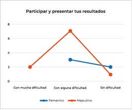 En la participación en las reuniones, no se encontraron diferencias significativas, las mujeres tienen un promedio de 2.40 ± 0.54 y los hombres, 1.90 ± 0.56 (t ((8.3) = 1.64 p<0.137) (Figura 3).