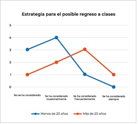 En cuanto a las estrategias de un posible regreso a clases las opiniones fueron: se considera siempre (6.6%), frecuentemente (26.7%), ocasionalmente (40%), no se ha considerado (26.7%); este último dato es el que llama la atención pues el regreso a clases en los centros escolares es una realidad inevitable, pero hay que recordar que la estructura educativa en los últimos ciclos escolares se desplazó al ámbito de los hogares en donde la relación alumno-docentes se realizó de forma virtual. Alzamora et al. (2020) estiman que las funciones pedagógicas de varias de las políticas educativas se trasladan a los directivos y docentes, en aspectos administrativos, organización del personal, insumos sanitarios, la priorización de la salud sobre la lógica propiamente pedagógica, que es el ámbito de interés que involucra a las escuelas.