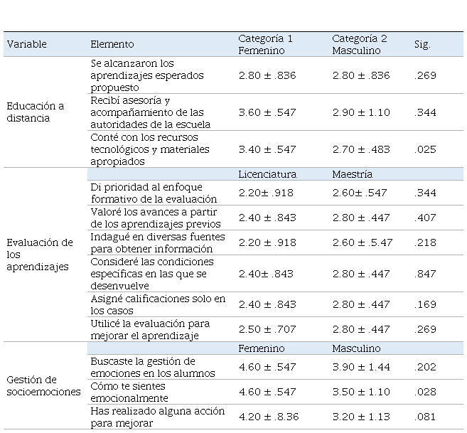 En lo que respecta a la intervención docente a distancia, evaluación de aprendizajes y participación en reuniones, en la Tabla 1, se muestran los resultados promedio y desviación estándar de las formas de intervención relacionadas con su trabajo docente a distancia, los criterios pedagógicos para la evaluación de los aprendizajes analizados en reunión de consejo y la gestión de socio emociones, con dos diferentes categorías: género y grado de estudios.
