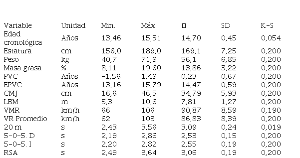 Este estudio incluyó 58 jugadores de fútbol en edades comprendidas entre 13,46 y 15,31 años con una estatura entre 156 - 189 cm, un peso entre 40,7 y 71,9 kg y masa grasa de 8,11-21,03% de sexo masculino, pertenecientes a tres clubes bogotanos. Para participar en este estudio los criterios de inclusión fueron ser jugador de futbol juvenil, todos los jugadores participaban en el futbol juvenil competitivo, torneos locales y nacionales (liga), con un mínimo de dos años de práctica y pertenecían a un club de los integrados a este estudio. Los criterios de exclusión fueron tener alguna dificultad en la salud o alguna lesión que impidiera la realización de pruebas físicas, (indagado en el consentimiento y con el equipo interdisciplinar de cada club) o no participar en las competencias requeridas.