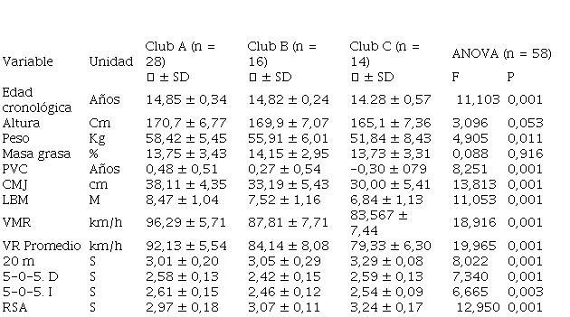 En la Tabla 3, se presenta una comparación según análisis de varianza ANOVA entre los clubes, siendo el club A con mayor cantidad de ventajas, tanto antropométricamente y PVC como en la mayoría de las pruebas de aptitud física, principalmente en fuerza y potencia, también se ve un mejor desempeño en la prueba de RSA y velocidad de remate. En la prueba de agilidad 5-0-5 I-D, el club B demuestra mejores resultados que los clubes A y C.
