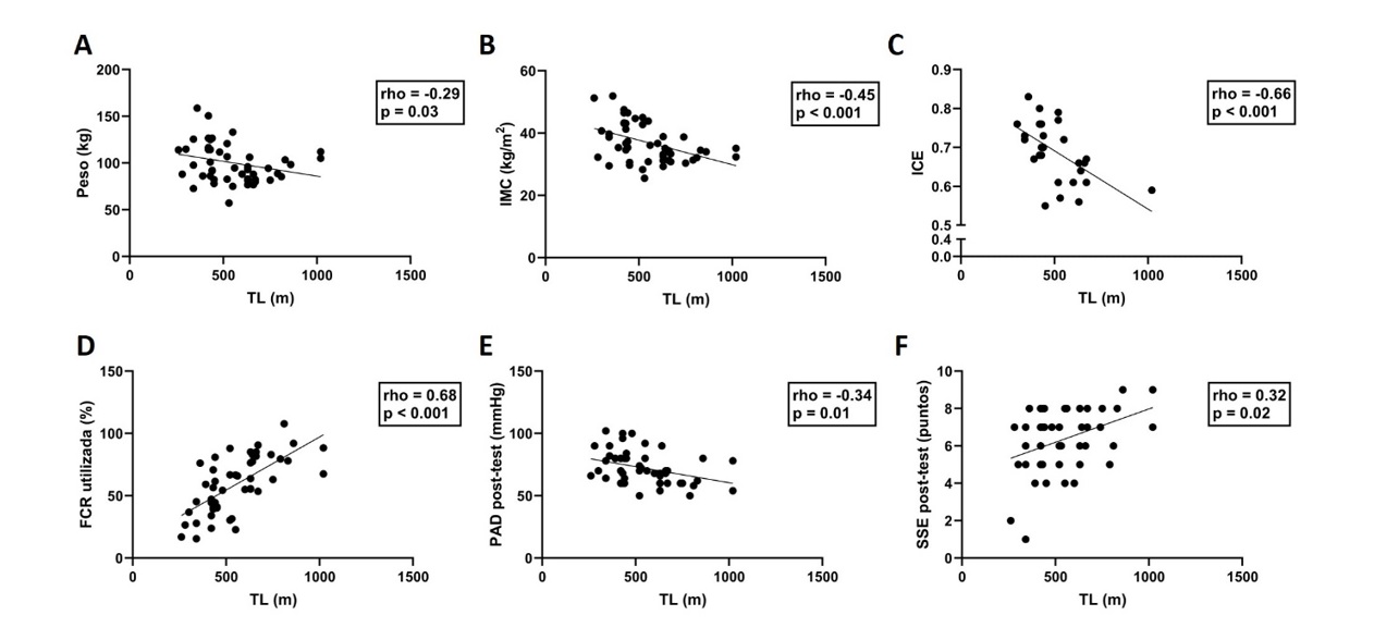 En relación al peso corporal, IMC e ICE estuvieron negativamente asociadas con el rendimiento en el TL (Figura 1, A-C). Respecto a los factores asociados a la respuesta fisiológica a la ejecución de la prueba, como era esperable, tanto el porcentaje de FCR utilizada como la SSE post-prueba estuvieron positivamente asociados con el rendimiento en el TL, mientras que la PAD mostró una asociación negativa (Figura 1, D-F).