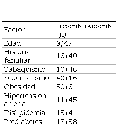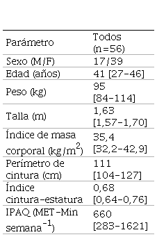 En este estudio participaron 56 candidatos a CB. Las características generales de la muestra están descritas en la Tabla 1. En ella destaca que el grupo fue compuesto mayoritariamente por mujeres con una mediana de IMC de 35,4 kg/m2 y un índice cintura-estatura de 0,68. Cabe destacar que sólo pudimos contar con la medición de perímetros de cintura de 33 participantes. En términos de la presencia de factores de riesgo cardiovascular, destacan la alta prevalencia de sedentarismo dentro de los participantes (Tabla 2).