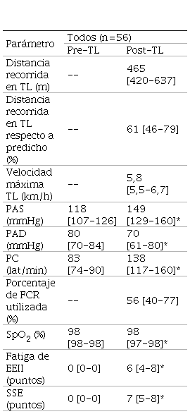 En términos del rendimiento durante el TL (Tabla 3), los participantes recorrieron una mediana de 465 metros, correspondiente a un 61% de la distancia predicha según fórmula de predicción. A su vez, en su respuesta fisiológica se observaron ascensos significativos en la presión arterial sistólica (PAS), frecuencia cardiaca (FC) (correspondiente a una utilización de un 56% de la reserva), además de aumentos de la SSE y sensación de fatiga en EEII. Además, tanto la PAD como la oximetría de pulso se mantuvieron estables (Tabla 3).