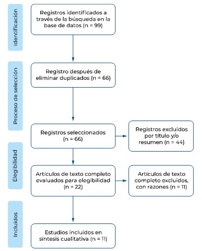 Inicialmente se identificaron 99 documentos en las bases de datos escogidas, posterior a la eliminación de duplicados, fueron seleccionados 66 documentos los cuales fueron leídos por título y/o resumen en búsqueda de información pertinente al tema de investigación, siendo excluidos 44 artículos, dejando 22 documentos para la lectura completa. Estos 22 artículos fueron leídos completa y detalladamente, siendo excluidos 11 documentos. Finalmente, 11 artículos cumplieron los criterios de inclusión para efectos de esta investigación (Figura 1).