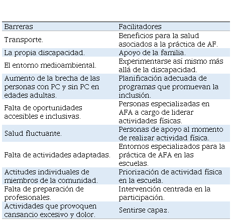 Dentro de las barreras presentadas en los diversos artículos, encontramos: el acceso a transporte (desplazamientos), entorno medio ambiental, la misma discapacidad (PC) y limitaciones prácticas, en donde disminuyen la posibilidad de que las personas con PC permanezcan en la actividad física y su entorno, dejándolos fuera de todo este mundo deportivo. Por otro lado, los facilitadores que más se dan a conocer en la variedad de estudios son la familia como foco principal, acompañada de su entorno y la estimulación temprana que desarrollen desde que son pequeños.