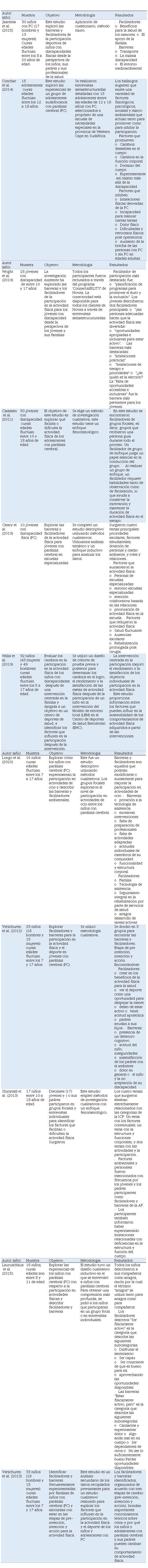 A diferencia Verschuren et al. (2013) es quien evalúa 33 niños (18 hombres y 15 mujeres) cuyas edades fluctúan entre 7 a 17 años, en conjunto con sus padres. Este realiza un análisis cualitativo, a través de entrevistas profundas a los individuos de las muestras. Este análisis, demostró que las barreras y facilitadores encontrados se subdividirían en 3 categorías llamadas pre intención, intención y acción, las cuales poseen distintas subcategorías que de forma general encuentra en los facilitadores conceptos importantes como ver el deporte como una oportunidad para despejar la mente, entendemos esto como que el beneficio de la actividad física no es solo físico, sino que psicológico. Y, dentro de las barreras identificamos lo anterior igualmente con la subcategoría el niño y la no aceptación de su discapacidad, ya que también algo físico influye en lo psicológico.