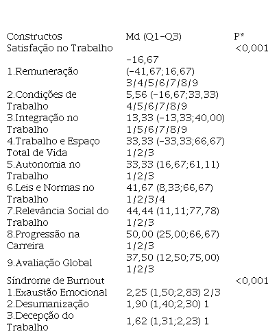 A dimensão de Desumanização apresentou fraca correlação com as dimensões de Trabalho e Espaço Total de Vida (r=0,369) e Relevância Social no Trabalho (r=0,385). Por outro lado, as dimensões: Condições de Trabalho (r=0,457), Autonomia no Trabalho (r=0,537) e Integração no Trabalho (r=0,542) do constructo da Satisfação no Trabalho apresentaram correlações moderadas. Além disso, a dimensão Decepção no Trabalho apresentou fraca correlação com Condições de Trabalho (r=0,344) e Leis de Normas no Trabalho (r=0,362). As demais dimensões do constructo de Satisfação no Trabalho apresentaram correlações moderadas, as quais foram: Autonomia no Trabalho (r=0,485), Progressão na Carreira (r=0,559), Integração no Trabalho (r=0,463), Trabalho e Espaço Total de Vida (r=0,478) e Relevância Social no Trabalho (r=0,453) (Tabela 5).