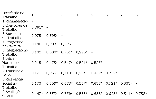 Ao correlacionar o constructo da Satisfação no Trabalho (Tabela 3) observou-se forte correlação da avaliação global com as dimensões de Condições de Trabalho (r=0,658), Autonomia no Trabalho (r=0,779), Integração no Trabalho (r=0,688), Leis e Normas no Trabalho (r=0,698) e Relevância Social no Trabalho (r=0,738). Por outro lado, as dimensões de Remuneração (r=0,447) e Progressão na Carreira (r=0,536) evidenciaram moderada correlação com a avaliação global.