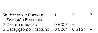 Em relação ao constructo da Síndrome de Burnout (Tabela 4), evidenciou-se correlação muito forte entre as dimensões Exaustão Emocional e Decepção no Trabalho (r=0,820). Correspondência forte foi evidenciada entre as dimensões Exaustão Emocional e Desumanização (r=0,602). Por fim, observou-se correlação moderada entre as dimensões Desumanização e Decepção no Trabalho (r=0,519).
