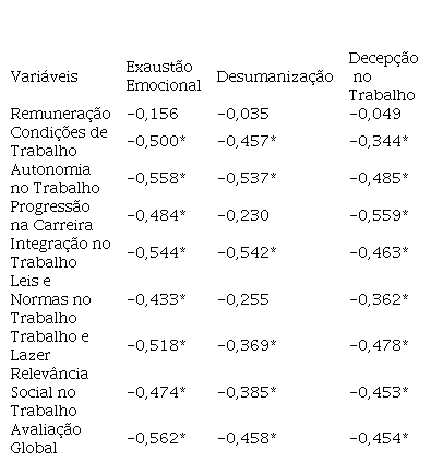 Ao correlacionar os constructos da Satisfação no Trabalho e da Síndrome de Burnout (Tabela 5), constatou-se que as dimensões da Síndrome de Burnout evidenciaram moderada correlação com a avaliação global da satisfação no trabalho, sendo que a dimensão Exaustão Emocional (r=0,562) evidenciou o maior índice de correlação. Em complemento, de modo geral a dimensão Exaustão Emocional apresentou os maiores índices de correspondência moderadas com a maioria das dimensões do constructo da Satisfação no Trabalho: Condições de Trabalho (r=0,500), Autonomia no Trabalho (r=0,558), Progressão na Carreira (r=0,484), Integração no Trabalho (r=0,544), Leis e Normas no Trabalho (r=0,433), Trabalho Espaço Total de Vida (r=0,518), Relevância Social no Trabalho (r=0,474), quando comparada com as demais dimensões da Síndrome de Burnout. Ressalta-se que a dimensão Remuneração não apresentou correlação significativa com as dimensões da Síndrome de Burnout.