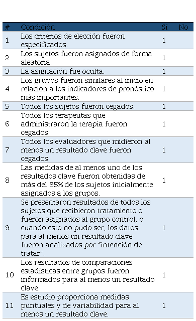 Esta escala está conformada por 11 condiciones, donde valores positivos se puntúan con "1" y valores negativos con "0". Los ítems entre 2 y 9 se refieren a validez interna de la metodología empleada y los ítems 10 y 11 hacen referencia al tratamiento estadístico empleado por los autores (Tabla 1). Por medio de esta escala evaluamos la calidad de los estudios haciendo énfasis en la incidencia de la fuerza en las variables bioquímicas y de composición corporal con diseños de pre-test y post-test de la literatura seleccionada.