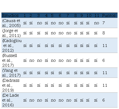 Los estudios de esta revisión presentaron un rango entre 6 a 11 puntos con un promedio de 8.57 evidenciados en la Tabla 2. Dentro de los estudios tres artículos presentaron 11 puntos (42.8 %), dos artículos, 6 puntos (28.5 %) y dos artículos con valores entre 7 y 8 cada uno con 14.3 %, respectivamente.
