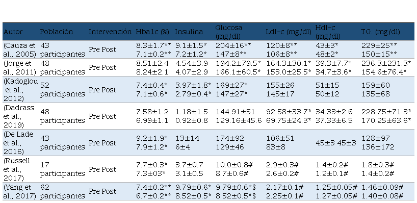 El estudio con mayor efecto en todas las variables bioquímicas sanguíneas en especial en el perfil lipídico: Ldl-c (ES:1.77); Hdl-c (ES: 1.98); y TG (ES:3.88) fue el de (Cauza et al., 2005) donde se observó mejora principalmente en glucosa, a su vez el estudio de Yang et al., (2017) fue el que más afecto Hba1c (ES:3.53).