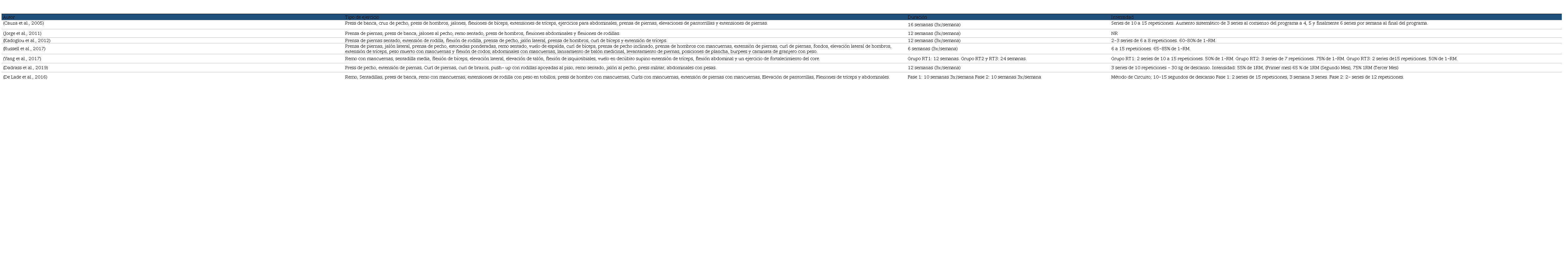 Todos los estudios seleccionados, utilizaron el entrenamiento de la fuerza como intervención principal; de los ocho estudios seleccionados, cinco de ellos utilizaron como medio de optimización de la carga de % de 1-RM, y los restantes utilizaron el tiempo como medida para la cantidad de repeticiones realizadas y los demás realizaron aumento sistemático partiendo de una base de repeticiones.