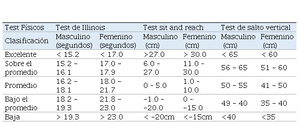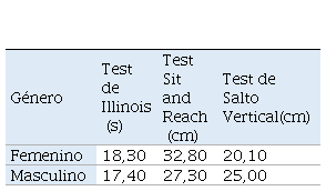 En el marco de la condición física se aplicó los test de: Illinois, sit and reach y salto vertical que permitieron cuantificar la agilidad, flexibilidad de musculatura isquiotibial y fuerza explosiva del tren inferior respectivamente.