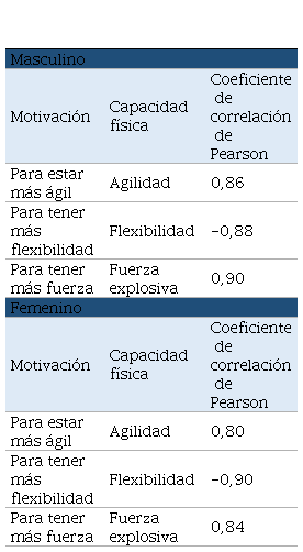Las correlaciones entre los resultados de los test físicos y las motivaciones asociadas a la agilidad, flexibilidad y fuerza son altas. Siendo positivas en el caso de la agilidad (0.86 en hombres y 0.80 en mujeres) la fuerza (0.90 en hombres y 0.84 en mujeres) y negativa para la flexibilidad (-0.88 en hombres y -0.90 en mujeres). Esto significa que los adolescentes están conscientes de sus fortalezas y debilidades físicas, mostrando la motivación necesaria para mejorar sus flaquezas y por consiguiente sus habilidades en las artes marciales que practican.
