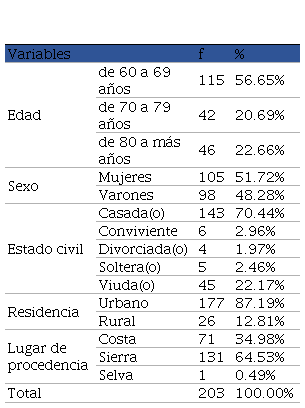 Estuvo conformada por el total de los miembros adultos mayores de la Iglesia Adventista del Séptimo Día del distrito de José Carlos Mariátegui en San Juan de Lurigancho y el Distrito de Lurín, registrados en el libro de feligresía, haciendo un total de 250 adultos mayores. Para el cálculo de la muestra se tuvo en cuenta un muestreo censal, no probabilístico y por conveniencia, es decir, que todos los elementos de la población no dependen de la probabilidad, sino de las características de la investigación (Hernández-Sampieri et al., 2014), además se consideraron criterios de inclusión como tener de 60 años a más, desear participar de manera voluntaria en la evaluación y, como criterios de exclusión, no contar con el consentimiento informado, no completar las evaluaciones por completo, llegando a un tamaño de muestra de 203 sujetos, distribuidos tal y como se expone en la Tabla 1.