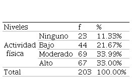 En la Tabla 2, se aprecian los niveles encontrados con respecto a la actividad física y al deterioro cognitivo, con respecto a la actividad física un 33.99% tiene un nivel moderado de actividad física, seguido de un 33% que tiene alto nivel de actividad física, un 21.67% tiene bajo nivel de actividad física y un 11.33% no tiene ningún tipo de actividad física. Cabe mencionar que se realizó la clasificación en función del uso de los puntos de corte de los percentiles, considerando el percentil 33 y 66 (cuyos puntajes directos son 303.72 y 1032.24 [Met x semana], respectivamente).