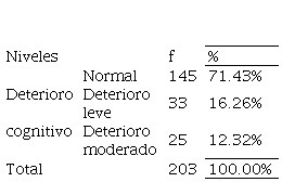 Con respecto a los resultados del deterioro cognitivo se tiene en la Tabla 3 que: un 74.43%, no cuenta con ningún tipo de deterioro cognitivo; un 16.26%, tiene un deterioro cognitivo leve y un 12.32%, tiene un deterioro cognitivo moderado, no se evidencian casos de deterioro severo dentro de los evaluados.