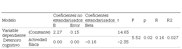 Para el logro del objetivo planteado, el cual se centra en identificar que la actividad física tiene relación con el deterioro cognitivo, como se muestra en la Tabla 4, el análisis de regresión lineal entre las dos variables propuestas en donde a un nivel de confianza del 95% se aprecian valores significativos (p=0.02; p<0.05) por lo que se concluye que existe relación entre la actividad física y el deterioro cognitivo, dicho efecto es negativo, por lo que se comprende que en tanto mayor sea la actividad física, menor será el deterioro cognitivo.