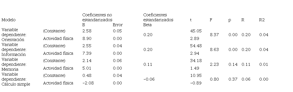 En la Tabla 5, se presenta el análisis de regresión para identificar la relación entre la actividad física con las dimensiones del deterioro cognitivo, en donde a un nivel de confianza del 95% se identifican que sí existe relación significativa entre la actividad física con la dimensión de orientación (p=0.00; p<0.05) e información (p=0.00; p<0.05); no se evidencia relación entre la actividad física con la dimensión de memoria y cálculo simple.