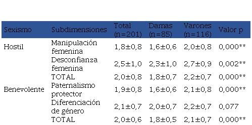 En la Tabla 2 se aprecia los puntajes de las dimensiones del sexismo hostil y sexismo benevolente. La subdimensión desconfianza femenina es la que presenta los puntajes más altos de sexismo (2,5±1,0) y la subdimensión manipulación femenina es la que presenta los puntajes más bajos (1,8±0,8). El sexismo hostil obtuvo un puntaje similar al sexismo benevolente. En la misma se aprecian los puntajes de las dimensiones del sexismo hostil y sexismo benevolente según el sexo de la muestra. La subdimensión desconfianza femenina es la que presenta los puntajes más altos de sexismo (2,7±0,9) en varones y en cuanto a los puntajes más bajos son de las damas en la subdimensión manipulación femenina (1,6±0,6) y en la subdimensión de paternalismo protector (1,6±0,6). El sexismo hostil obtuvo un puntaje similar al sexismo benevolente.