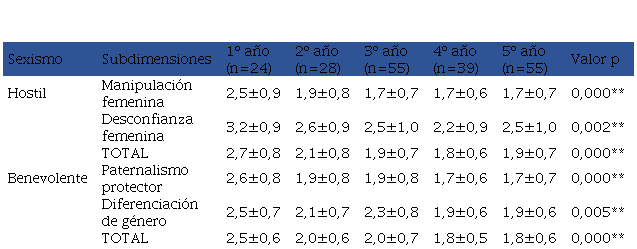 En la Tabla 3, se muestran las pruebas ANOVA comparando los puntajes de cada dimensión del sexismo hostil y ambivalente según año de la carrera de la muestra. En la dimensión manipulación femenina, desconfianza femenina y paternalismo protector los/as estudiantes de primer año presentan mayores puntajes de sexismo en comparación con los otros cuatro años. En la dimensión diferenciación de género los/as estudiantes de primer año presentan mayores puntajes de sexismo en comparación con cuarto y quinto año. Finalmente, en sexismo hostil y sexismo benevolente los/as estudiantes de primer año presentan mayores puntajes de sexismo en comparación con los otros cuatro años.