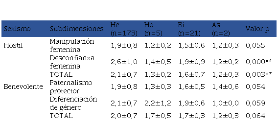 En la Tabla 4, se muestran las pruebas ANOVA comparando los puntajes de cada dimensión del sexismo hostil y ambivalente según orientación sexual de la muestra. La dimensión desconfianza femenina presenta diferencias significativas donde los/as estudiantes que se declaran heterosexuales presentan mayores puntajes de sexismo que los/as que se declaran homosexuales y bisexuales. En el sexismo hostil los/as estudiantes que se declaran heterosexuales presentan mayores puntajes de sexismo que los/as que se declaran bisexuales.