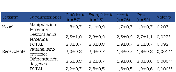 La autopercepción de sexismo según la variable sociodemográfica de creencias religiosas es más alta en los/as estudiantes católicos/as y evangélicos/as en la subdimensión de sexismo benévolo. Esto se puede explicar ya que las instituciones religiosas son las que más valores y tradiciones determinadas predican y practican (Mikolajczak & Pietrzak, 2014, citado en Mori, 2021) encasillando al hombre en el rol dominante y protector y a la mujer bajo la sumisión de éste (Cassese & Holman, 2016).