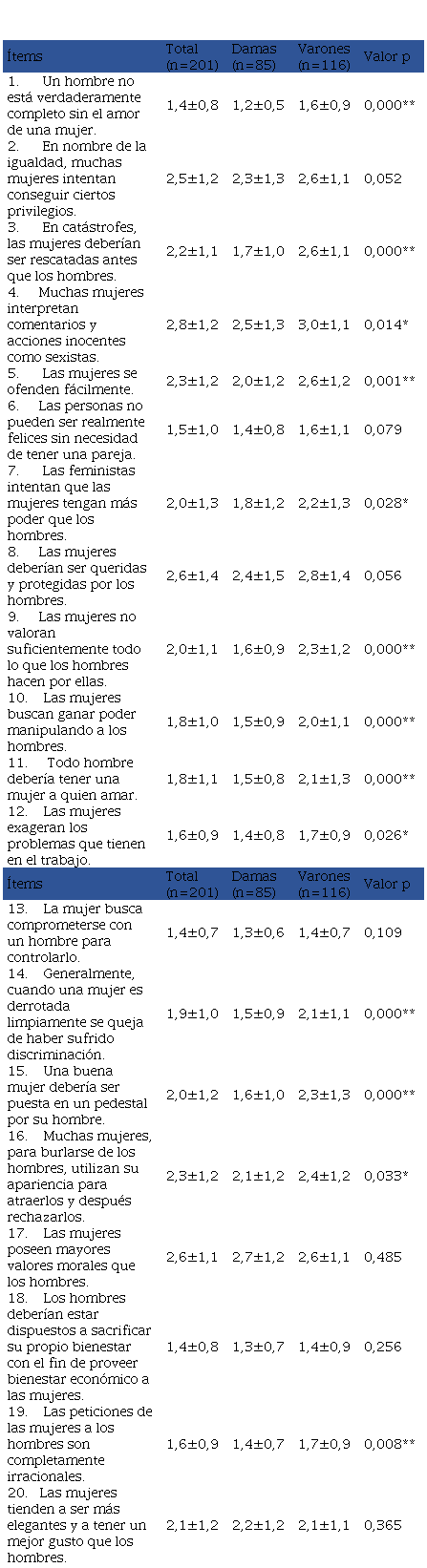 En la Tabla 1 se muestran los puntajes obtenidos en cada ítem del Inventario de sexismo ambivalente. Es posible notar que los ítems que obtuvieron los puntajes más bajos fueron el ítem 1. Un hombre no está verdaderamente completo sin el amor de una mujer (1,4±0,8), el ítem 13. La mujer busca comprometerse con un hombre para controlarlo (1,4±0,7) y el ítem 18. Los hombres deberían estar dispuestos a sacrificar su propio bienestar con el fin de proveer bienestar económico a las mujeres (1,4±0,8). Por el contrario, los ítems que presentan un mayor puntaje de sexismo son el ítem 4. Muchas mujeres interpretan comentarios y acciones inocentes como sexistas (2,8±1,2), el ítem 8. Las mujeres deberían ser queridas y protegidas por los hombres (2,6±1,4) y el ítem 17. Las mujeres poseen mayores valores morales que los hombres (2,6±1,1). En general, las puntuaciones de cada ítem revelan niveles bajos o medios-bajos de sexismo.