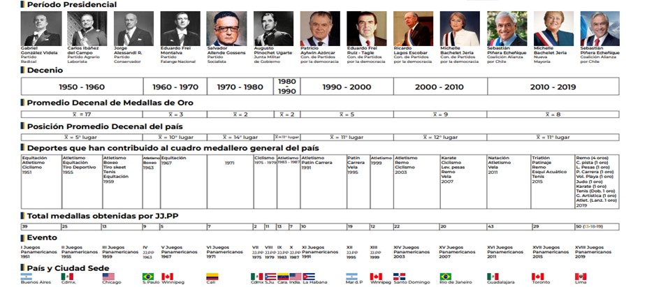 La ubicación de un onceavo lugar, decimo, noveno u octavo lugar dista del performance relativo que tenía Chile a mitad del siglo pasado. Ello quiere decir, que el país se ha ido quedando atrás comparativamente en relación con los esfuerzos que han realizado países vecinos, como por ejemplo Brasil, Colombia, Argentina y Venezuela en materia deportiva, todos ellos, con mayor trascendencia deportiva, con estructuras más sólidas y, por tanto, con mayor historia de desarrollo. Lo descrito, en la actualidad tiene a Chile en el tercer grupo de países a nivel Panamericano, donde además se encuentran República Dominicana, Perú y Ecuador.