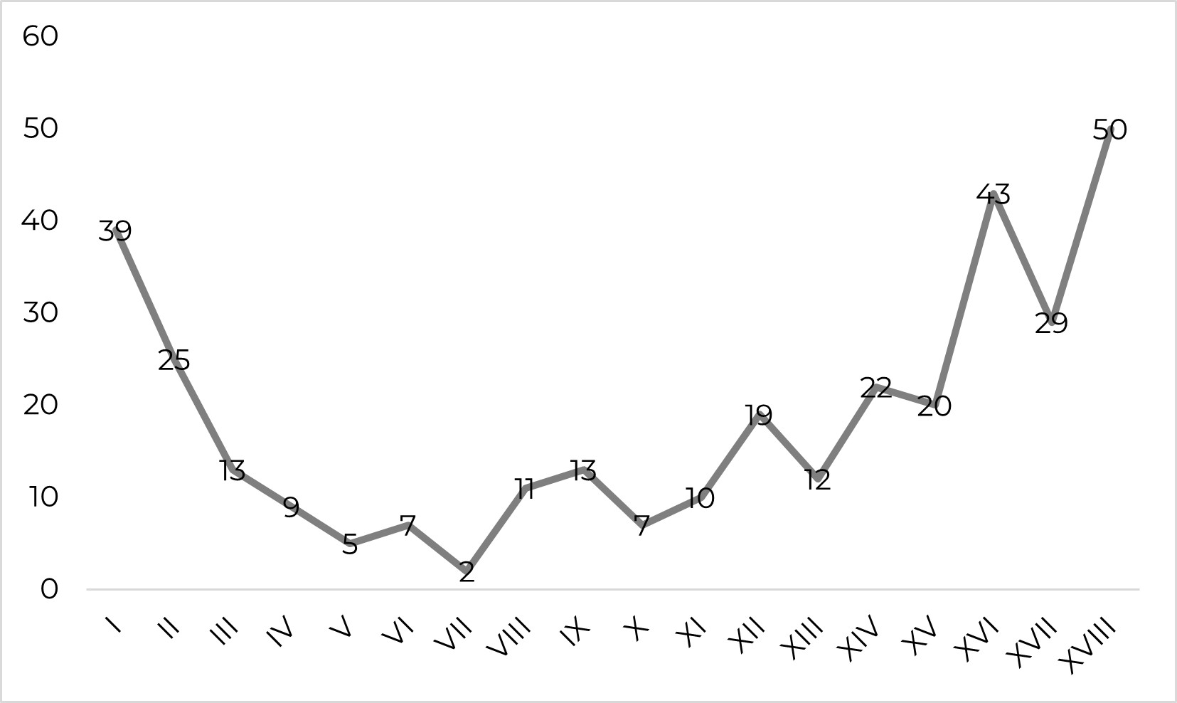 En la Figura 2, se presentan los datos de la Tabla 3 sobre la estimación el total de medallas obtenidas por la delegación chilena en todas las ediciones de los Juegos Panamericanos. En la gráfica, se aprecia que las medallas obtenidas a través del tiempo presentan una leve forma de “U”, cuya base se concentra principalmente entre los eventos V y X, para posteriormente remontar de manera ascendente. Así, el pronóstico estimado arroja para los próximos Juegos, un total de 46 - 50 medallas.