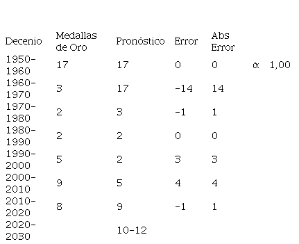 En relación con el objetivo de la investigación y los datos disponibles, como se señaló anteriormente , se decidió utilizar el método de suavización exponencial simple (Brown, 1959; 1963) el cual ya ha sido aplicado en otras investigaciones en el ámbito del deporte (Clarke, 2011; Coyne et al., 2021). El método SES, es una técnica de pronóstico, es parte de la estadística inferencial, utiliza promedios históricos y permite realizar una predicción o comportamiento futuro basado en una media ponderada de los valores actuales y de los pasados. Esta técnica, permite visualizar de manera esquemática el potencial desempeño de Chile en los próximos Juegos Panamericanos de Santiago 2023.