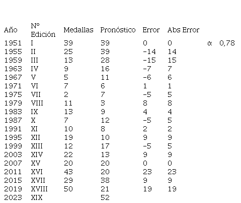 Palabras clave: Juegos Panamericanos, Rendimiento deportivo, Deporte de élite, Técnica de pronóstico, Suavización exponencial simple.