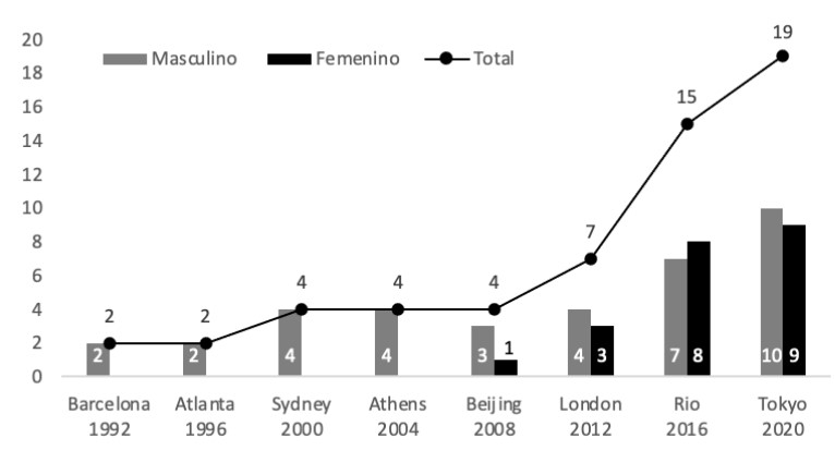 Sumado a la información anterior, la Tabla 1 muestra también, la cantidad absoluta de participantes, medallistas, modalidades y tipos de discapacidad de los atletas en todas las participaciones en JJPPV y JJPPI. Se observó que Chile conquistó un total de siete medallas en JJPPV, siendo tres de oro (42.85%), tres de plata (42.85%) y una de bronce (14.28%). Clasificando las medallas conquistadas a partir de los grupos de discapacidades elegibles, la DF es responsable del mayor número de medallas, con dos de oro, tres de plata y una de bronce, totalizando seis medallas (85.71%), seguido de la DV con una de oro (14.28%). Todas las medallas se concentran en las modalidades individuales, siendo: Natación (NA) con 3 (Oro = 1 y Plata = 2), Atletismo (AT) con 2 (Oro = 2), Tiro con arco (AR) con 1 (Plata = 1) y Canotaje (Bronce = 1)