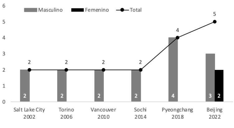 En el Figura 2, se percibe que entre los años 2002 y 2014, la cantidad de deportistas en JJPPI se mantuvo constante, siendo dos deportistas, en pruebas masculinas. En los JJPPI Pyeongchang 2018, la cantidad de deportistas que representaron a Chile se duplicó en relación con las participaciones en las ediciones de JJPPI realizadas entre 2002 y 2014, llegando a cuatro participantes. En los JJPPI Beijing 2022, aparece una representante femenina en la delegación, donde la deportista Claudia Hernández compitió en las pruebas femeninas de Giant Slalom Standing y Slalom Standing, siendo ésta la primera participación femenina en los JJPPI.