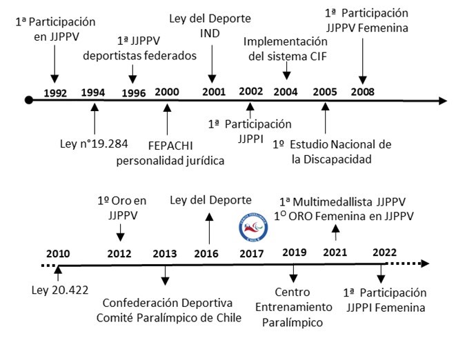 En Chile la preocupación por las PeSD existe desde 1947 por parte de organizaciones civiles, con la Sociedad Pro Ayuda del Niño Lisiado. Para Jaime Arriagada (2014), la rehabilitación es la preocupación básica de la sociedad antes mencionada, como también la entrega de atención médica, educación e instrucción, todo ello, de acuerdo con sus posibilidades técnicas y económicas, buscando la inclusión de las personas a la sociedad. El 8 de diciembre de 1978 se dio inicio a la primera Teletón chilena, la cual duró 27 horas, bajo el lema “Logremos el Milagro”. Los dueños de radioemisoras, diarios y revistas dispusieron gratuitamente espacios para que de manera colaborativa motivaran a la comunidad a unirse a la maratón televisiva para intentar unir a todo el pueblo chileno en torno a esta obra de caridad. En dicho evento se recaudó el monto de 2,5 millones de dólares para acciones de la institución (Teletón, 2022). En los JJPPV de Barcelona 1992, Chile debutó en el escenario internacional, en un momento en que el 48% de los países reconocidos por la ONU participaban en los JJPPV (Organización Mundial de la Salud [OMS], 2022). En la ocasión, el debut ocurre con dos deportistas, Víctor Valderrama y Gabriel Vallejos Contreras en las modalidades Para Powerlifiting y Para Natación, respectivamente.