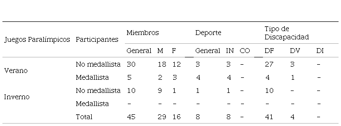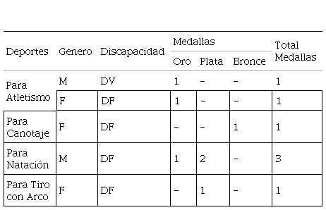 Entre todas las participaciones en los JJPPV, la delegación estuvo representada por 35 atletas, de los cuales el 14.28% fueron medallistas, mientras que en JJPPI participaron 10 atletas y hasta el momento no hubo registro de atletas medallistas (Tabla 1). Del total de medallistas, el 40% son hombres y el 60% son mujeres, en cuatro modalidades diferentes: para atletismo, para natación, para tiro con arco y para canotaje. En cuanto al tipo de discapacidad, el 80% de los atletas medallistas presentan discapacidad física y el 20% corresponde a discapacidad visual.