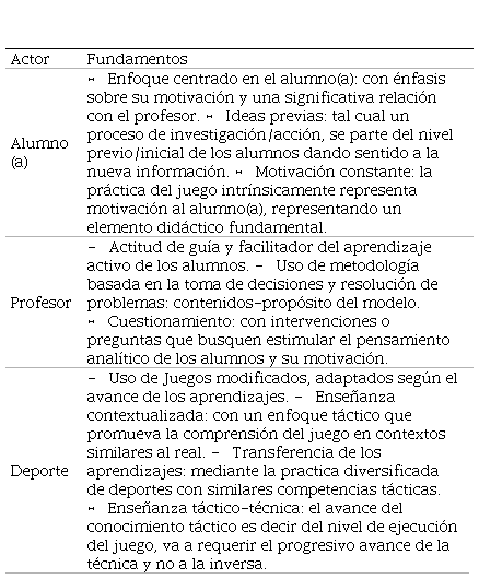 La Tabla 1, resume las orientaciones didácticas de la propuesta TGfU sobre los tres elementos base del modelo: el deporte, el alumno(a) y el profesor(a) (Abad et al., 2013; Castro, 2022).