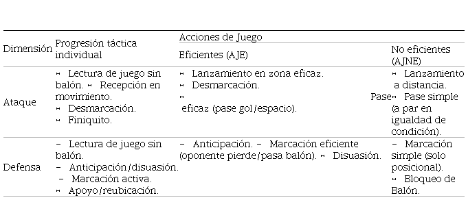 Fueron evaluadas las acciones AJE y AJNE en una realidad de 15 minutos de juego entre ambos grupos, mediante metodología observacional, definiendo su criterio “nomotético”: acerca de las unidades de estudio (GC y GE), de “seguimiento” en la temporalidad (Test diagnóstico y Retest post aplicación de unidades de aprendizaje) y “multidimensional” sobre las 10 acciones de juego evaluadas en ataque y defensa (Tabla 5). Por la naturaleza de los datos (AJE y AJNE), estos se registraron según su frecuencia. La evaluación no consideró las acciones de atajada o los goles convertidos, ya que dichas situaciones de juego pudieran desvirtuar las acciones realizadas previas al lanzamiento al arco.