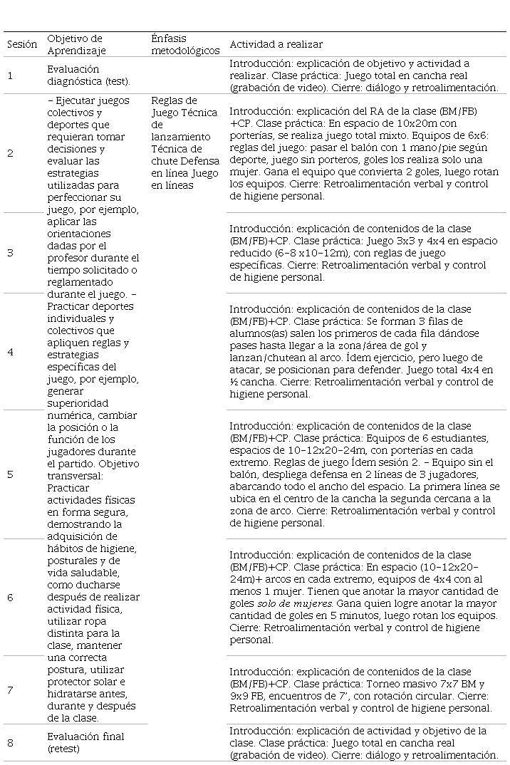 Se ejecutó una etapa experimental a ambos grupos de 23 alumnos(as) en forma aleatoria. Por una parte, el GC recibió la unidad de aprendizaje según Metodología Tradicional (MT), de acuerdo a la planificación didáctica propuesta por el Ministerio de Educación [MINEDUC], (2023) (Tabla 3). Por otra parte, el GE desarrolló la unidad de aprendizaje en base a Metodologías Comprensivas (MC) según modelo TGfU y DC (Tabla 4).