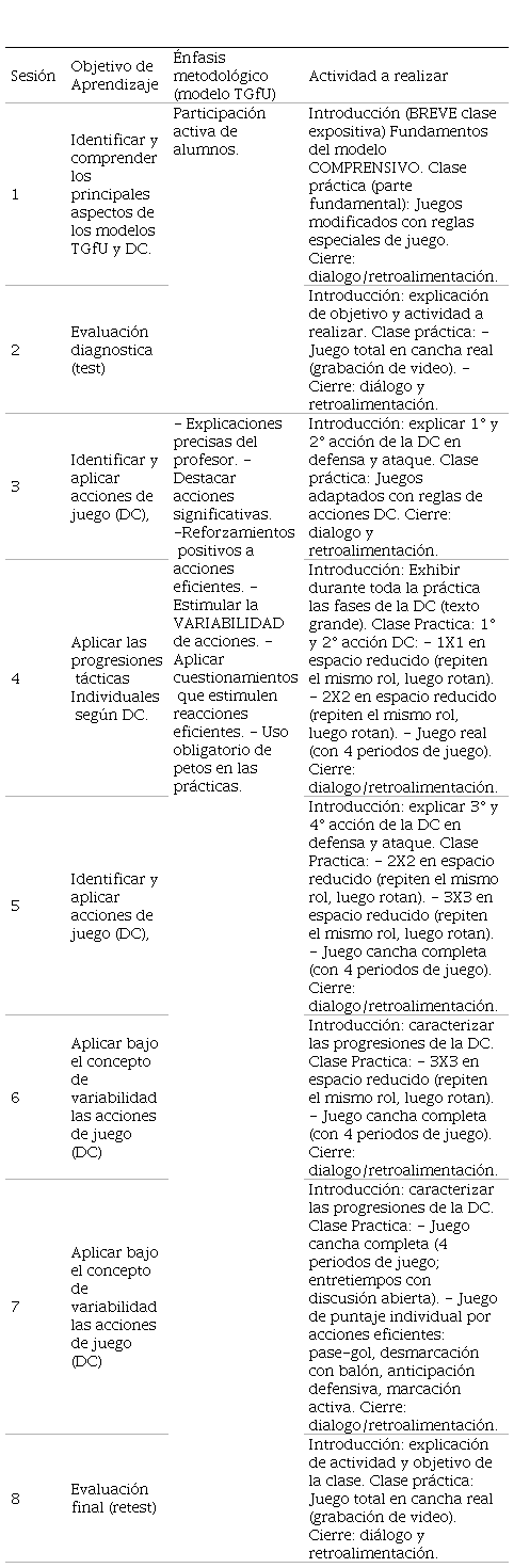 Ambos grupos realizaron 8 sesiones de intervención (2 semanales) con una duración de 1 hora 15 minutos, siendo administradas por los profesores titulares de la asignatura de educación física y deportes. La intervención fue informada, revisada y autorizada por la dirección de los colegios y los padres de los alumnos(as). Se aplicó el consentimiento informado a los participantes, mediante el cual tomaron conocimiento del propósito del estudio, sus derechos, confidencialidad y anonimato de su participación.