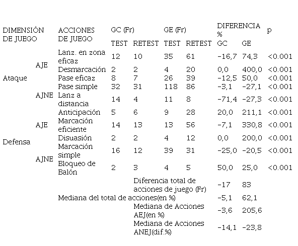 Se evidenció un efecto significativo de las intervenciones en el GE (F1;33 = 5.553; p = 0.025; .. = 0.144) sobre las AJE y de AJNE. La cuantificación de las acciones de juego, comparando la temporalidad del Test versus Retest, evidenció diferencias significativas entre los GC y GE, de las acciones de juego lanzamiento en zona eficaz (GE: 74,3% GC: -16,7%; p < 0.001) y pase simple (GE: -27,1% - GC: -3,1%; p < 0.001). Por otra parte mediante el análisis descriptivo de las tasas de ocurrencia, se obtuvieron diferencias importantes, no significativas, de las acciones de juego de Anticipación (GE:211,1% - GC:20%; p < 0.001), marcación eficiente (GE: 330,8% - GC: -7,1%; p < 0.001) y desmarcación (GE: 400% - GC: 0%; p < 0.001) (Tabla 5).