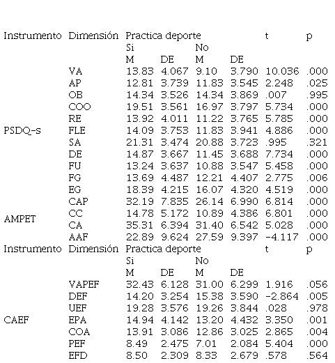 Los estudiantes que manifiestan practicar o no algún deporte o ejercicio físico de forma constante, se observan resultados con diferencias estadísticamente significativas en las dimensiones de Vida activa (VA), Apariencia (AP), Coordinación (COO), Resistencia (RE), Flexibilidad (FLE), Deporte (DE), Fuerza (FU), Físico global (FG), Estima global (EG), Competencia autopercibida (CAP), Competencia comparada (CC), Compromiso con el aprendizaje (CA), Ansiedad y agobio ante el fracaso (AAF), Dificultad de la Educación Física (DEF), Empatía con el profesor y la asignatura (EPA), Concordancia con la organización de la asignatura (COA) y Preferencia por la Educación Física y el deporte (PEF) (Tabla 3).