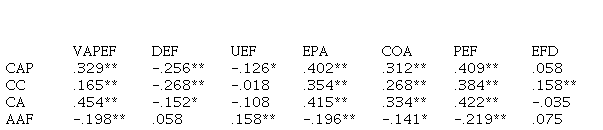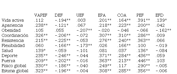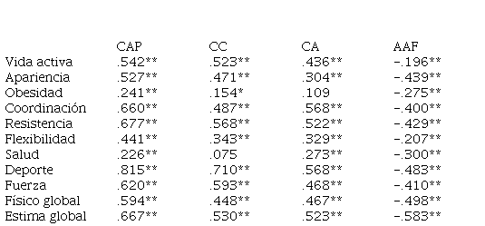 Con la finalidad de observar posibles relaciones entre las dimensiones del autoconcepto físico y de la motivación de logro (Tabla 4); autoconcepto físico y la actitud hacia la Educación Física (Tabla 5); y la motivación de logro junto a la actitud hacia la Educación Física (Tabla 6) se utilizaron correlaciones bivariadas, a través del coeficiente de correlación de Pearson, para obtener una estimación de las puntuaciones factoriales.