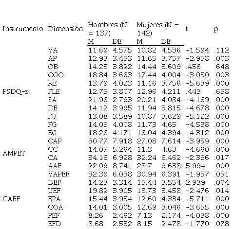 Al comparar las variables medidas, se observan diferencias estadísticamente significativas respecto al género de los estudiantes (mujeres y hombres) en las dimensiones de Apariencia (AP), Coordinación (COO), Resistencia (RE), Salud (SA), Deporte (DE), Fuerza (FU), Físico global (FG), Estima global (EG), Competencia autopercibida (CAP), Competencia comparada (CC), Compromiso con el aprendizaje (CA), Ansiedad y agobio ante el fracaso (AAF), Dificultad de la Educación Física (DEF), Utilidad de la Educación Física (UEF), Empatía con el profesor y la asignatura (EPA), Concordancia con la organización de la asignatura (COA) y Preferencia por la Educación Física y el deporte (PEF) (Tabla 2).