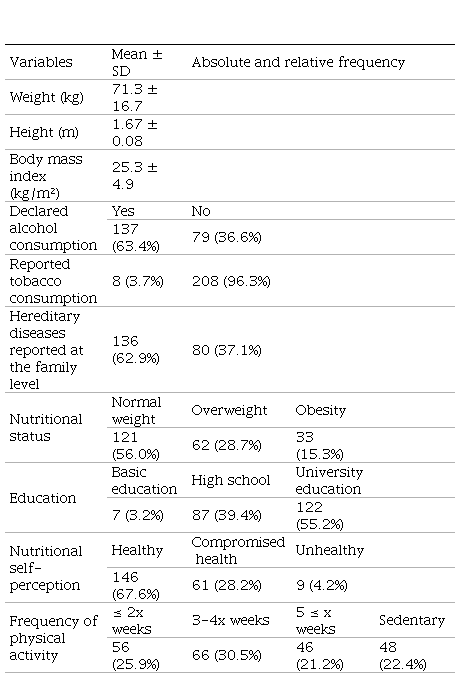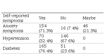 A relevant fact described in Table 2 shows self-awareness regarding the most prevalent chronic diseases: hypertension, diabetes, and mental health diseases, such as anxiety symptoms, hypertension, and diabetes. The best performance was observed in the knowledge about diabetes; 165 individuals (76.4%) reported recognizing and understanding a diabetes condition. On the other hand, despite being one of the most mentioned diseases regarding family history, hypertension was the least understood and recognized by 146 participants (63.7%). Anxiety symptoms were reported in 71.3% of participants, a factor highly elevated in this study.