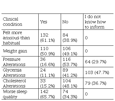 In the face of the changes caused by COVID-19, participants were asked about changes in their clinical condition during the pandemic, as shown in Table 3. Most participants reported feeling more anxious than habitual (61.1%) and experienced weight changes (50.9%). However, alterations in blood pressure were not a predominant factor among the study participants, as only 36 (16.6%) experienced this variation. When asked about changes in blood glucose and cholesterol levels, alarmingly high percentages of participants lacked the knowledge to respond, with 47.7% and 36.7% of participants, respectively. On the other hand, the most significant variant of changes caused by the pandemic was sleep quality, which was reported to be worse in 142 individuals (65.7%).